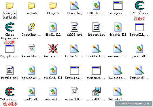 Cheat Engine (简称 CE )的作者为了让大家更快的熟悉软件的使用方法,发布的同时还附带了练习小程序 Tutorial.exe ,这个小序程将我们在修改游戏过程中所遇到的问题总结在一起,分成了 8 个关卡(5.5 版),让我们一步一步的学习,最终成为——游戏作弊高人! 本篇手记就是 Tutorial.exe 的第一关的闯关记录,我会尽量将我所理解的全盘记叙下来,有兴趣的朋友一起研究,共同进步吧~ 通过本关的任务,可以熟悉 CE 基本的操作界面,并可以解决最简单的数值修改问题。 在开始之前,我们先统一软件,否则研究起来可能会有不少的出入,CE 目前已经有了 5.6 版本,但汉化的版本好象还不甚完美,本手记使用 Cheat Engine 5.5 汉化中文版,英文牛人飘过好了…… 将下载的压缩包解压,已解压的文件夹下将包括如下图所示的文件: