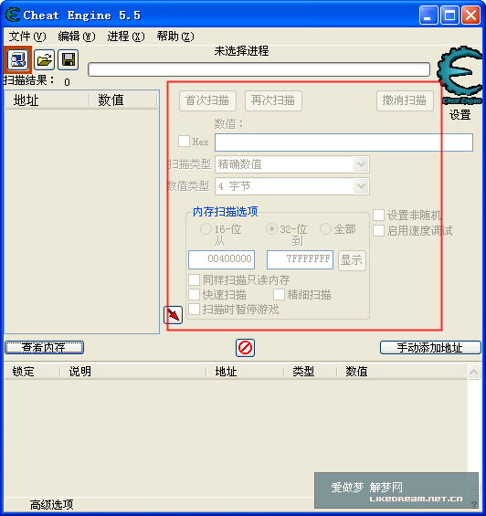 我们要关注的是图上用红字标注出的执行程序,执行汉化版程序,CE 主界面如下图所示: