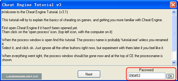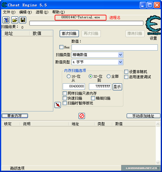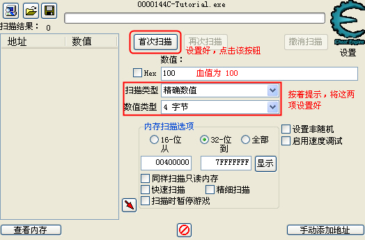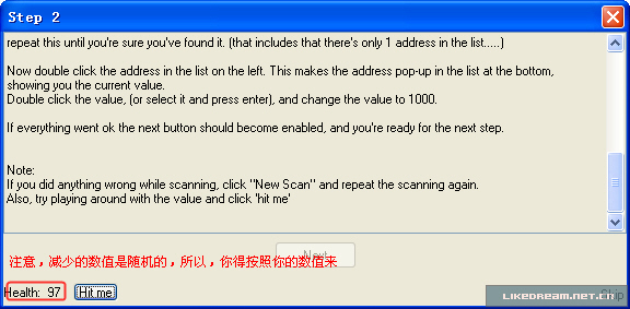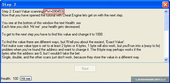 翻译如下: 步骤 2:精确数值扫描 (密码=090453) 现在你已经在 CE 中打开了 Tutorial ,为我们进入到下一步作好了准备。 在这个窗口的左下方的 Health (血值):XXX ,每次你点击 "Hit me" 时,血便会减少。 要进入下一关,你必须找到这个数值并把它改成 1000 。 有不少方法都可以找到这个数值的位置,但我会告诉你一个最简单的方法,“精确数值扫描”: 首先确认数值类型设置为2字节或4字节,当然,设置成1字节也可以的,但最终修改它的时候便会有点麻烦了(虽然很容易解决),如果该地址后边的字节数值都是 0 ,那么你设置成 8 字节也未尝不可,不过在这我们就不必尝试了。单浮点数,双浮点数,以及其他的扫描方在这里行不通的,因为它们储存数值的方式不同。 (注:1个字节所表示的最大数值为十进制的 255 ,十六进制为 FF ,2个字节所表示的最大数值为十进制的 65535 ,十六进制表示为 FF FF ;通常在游戏中很少有用8个字节表示数值) 当数值类型设置正确后,确认扫描类型设置在 "精确数值" ,把血的数值填在数值输入框上,并点击 "首次扫描" ,一会儿(如果你的电脑非常慢的话),扫描完毕后,扫描的结果将会显示在主界面的左侧。 如果你扫描到不止一个地址,你又不知道哪一个是正确的,那么继续点击 Tutorial 上的 "Hit me" ,并把变更后 血的数值 填到数值输入框中,然后点击 "再次扫描" ,重复这些步骤,直到你能确认你已经找到地址(在地址列表上只有一个地址)。 好,双击左边列表上的地址,这个地址便移动到下方的列表上并显示它的当前数值。 双击下方列表的中数值(或者选择它,按下回车),填入你要修改的数值:1000 。 如果操作正确,下一步按钮将会变成可点击的了,你就可以准备进入下一关了。 OK,我们一步一步的来,首先按下图所示填好界面中的选项: