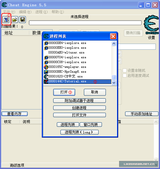 (注:网上有人将这个小程序汉化了,但在用 CE 分析时可能会出错,无法完成预定的关卡,建议大家还是用英文版的) 鉴于大家应该和我一样的英盲,下面将翻译过的文本提供给大家,上图中的文本大意如下: 欢迎你来到CE教程。 (v3.1) 这个教程是解释在游戏中作弊的基本步骤,并让你更熟悉CE的使用。 首先运行CE,如果你还没运行的话。然后点击 "请选择要调试的程序" 按钮 (在左上角有电脑图标的那个) 当进程列表窗口打开后,找到这个教程,进程的名字应该是 "tutorial.exe” ,除非你把它改名了,选择它,并点击 打开 。现在先不要管其他的按钮,如果你愿意的话,以后再研究它们。 如果没什么问题,进程列表窗口将会消失并且在 CE 主界面的上方会显示选择的进程名。 好了,点击 next 按钮继续到下一个步骤 (或者输入密码进入你想去的其它练习)。 明白说了什么,我们照做吧,点击那个不停闪烁电脑图,在弹出的进程列表中选择 Tutorial.exe ,打开它,如下图所示: