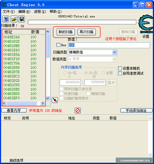 血值,呵呵,如果你刚才没有点击 "Hit me" 的话,它初始就是100,不信的话,你看上面的关于 Tutorial 图示?如果你已经忍不住点了两下,那么你要在 CE 数值框中填入你目前的血值再点击 首次扫描 按钮;第一次扫描,CE 找到 Tutorial 程序中所有值为100的地址,显示在左侧的列表中,如下图: