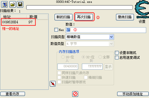现在,血值为97,将97填入 CE 的数值框中去,然后点击 "再次扫描" 按钮,如下图: