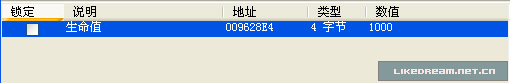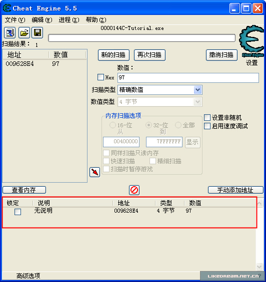 很快,CE找到了惟一的地址,双击它,或是点击图中